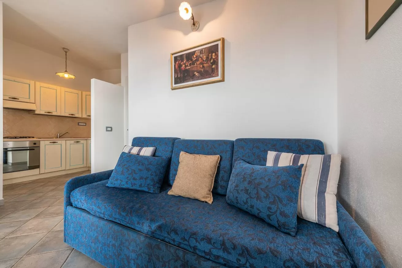 Zona giorno accogliente con divano letto e accesso diretto alla veranda