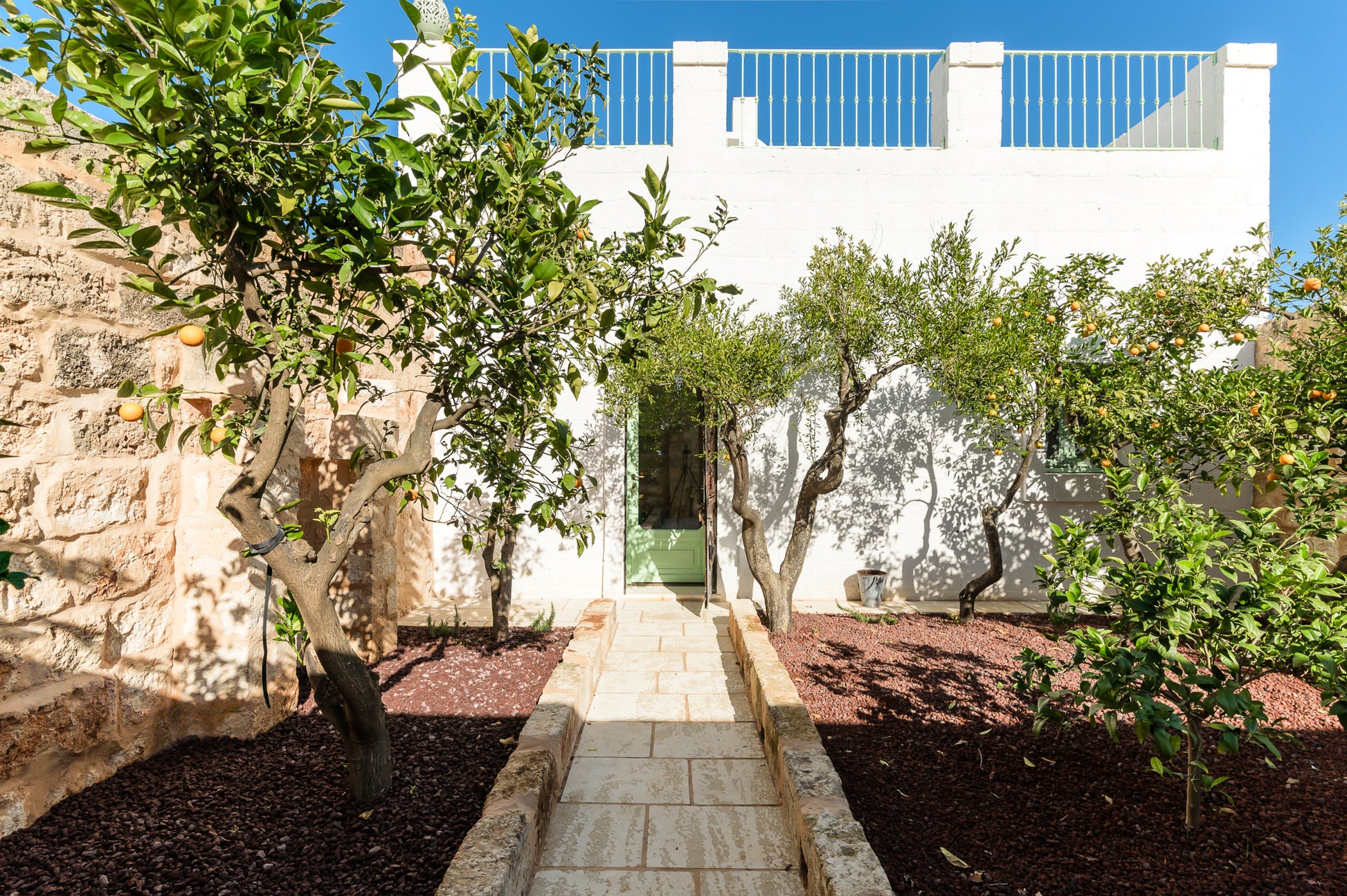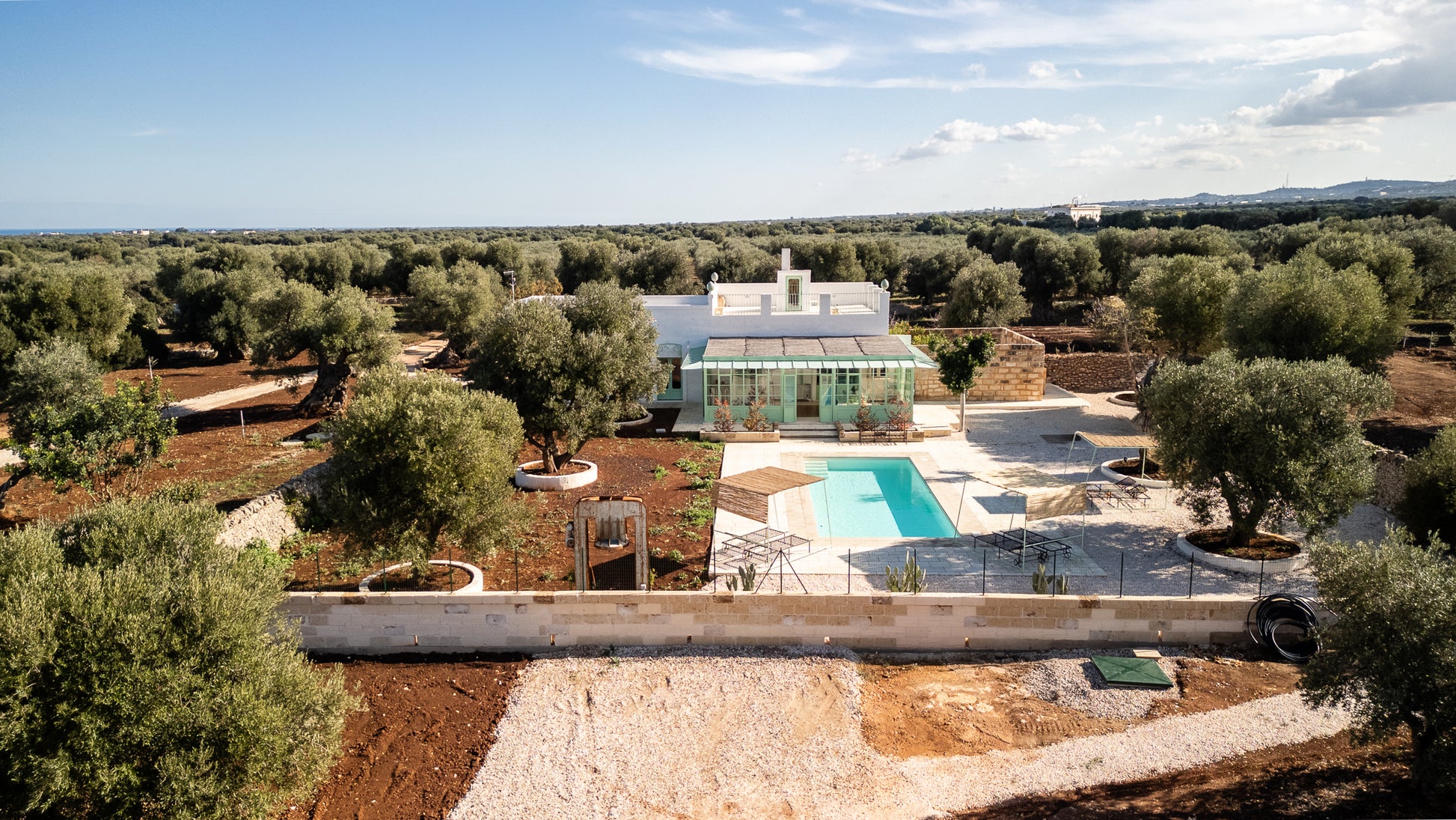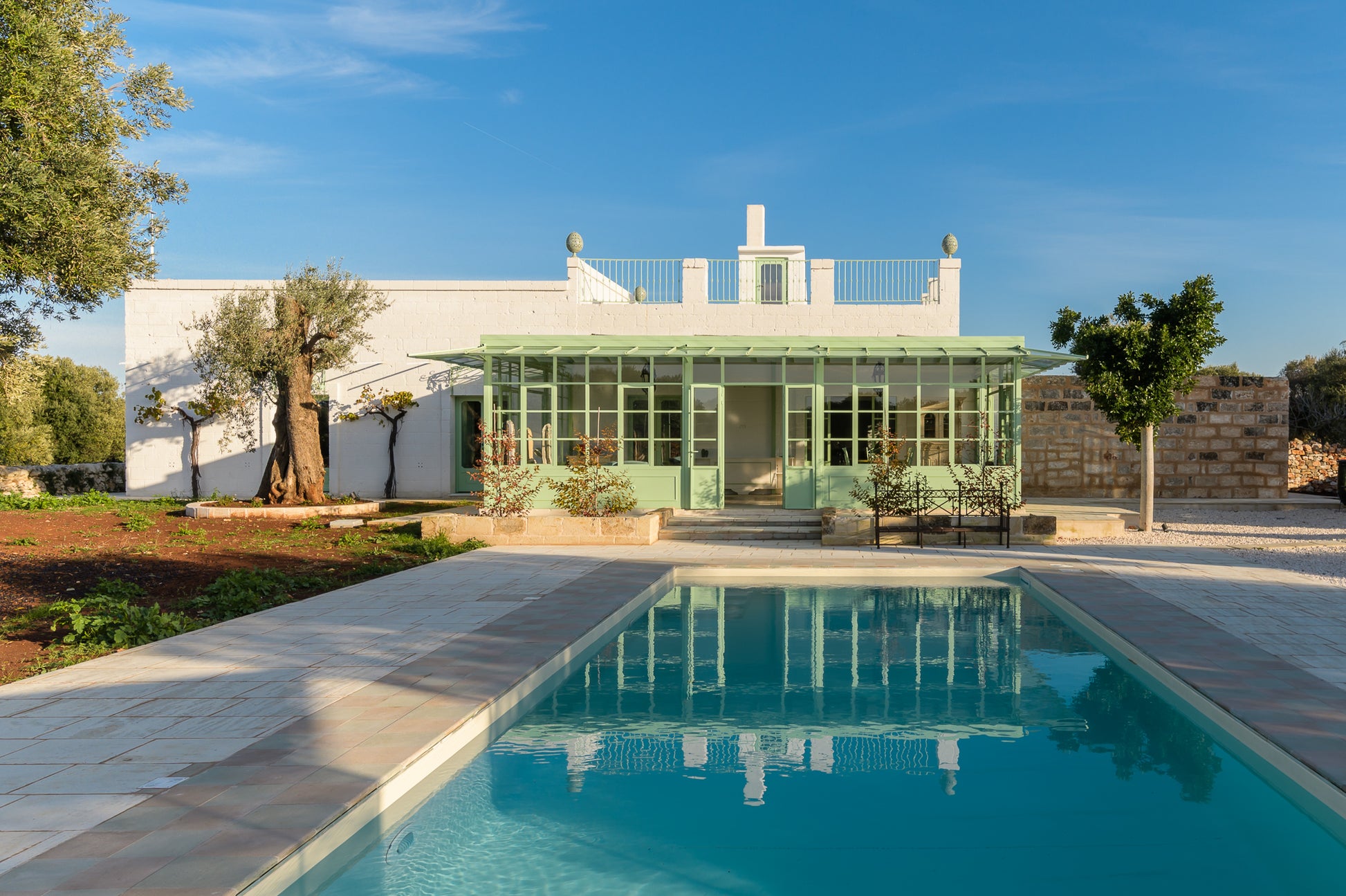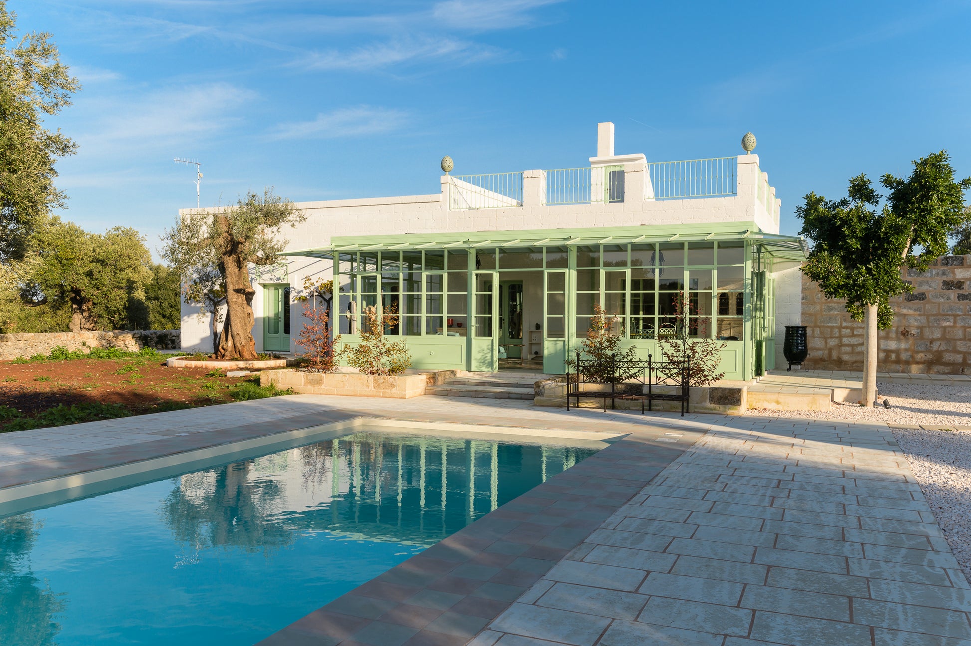 Ogni scorcio di questa masseria racconta una storia, ogni muro bianco riflette il sole pugliese. Il cuore della casa è la piscina privata, incastonata nel verde e circondata da quiete.