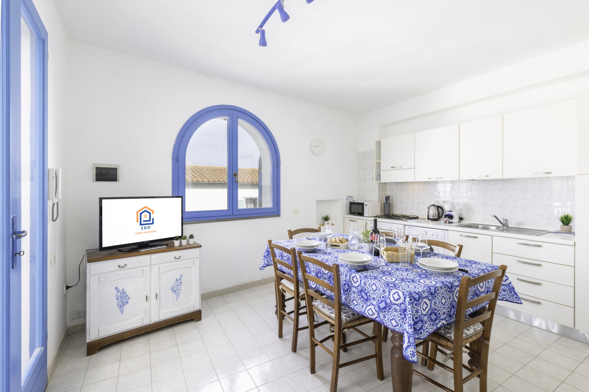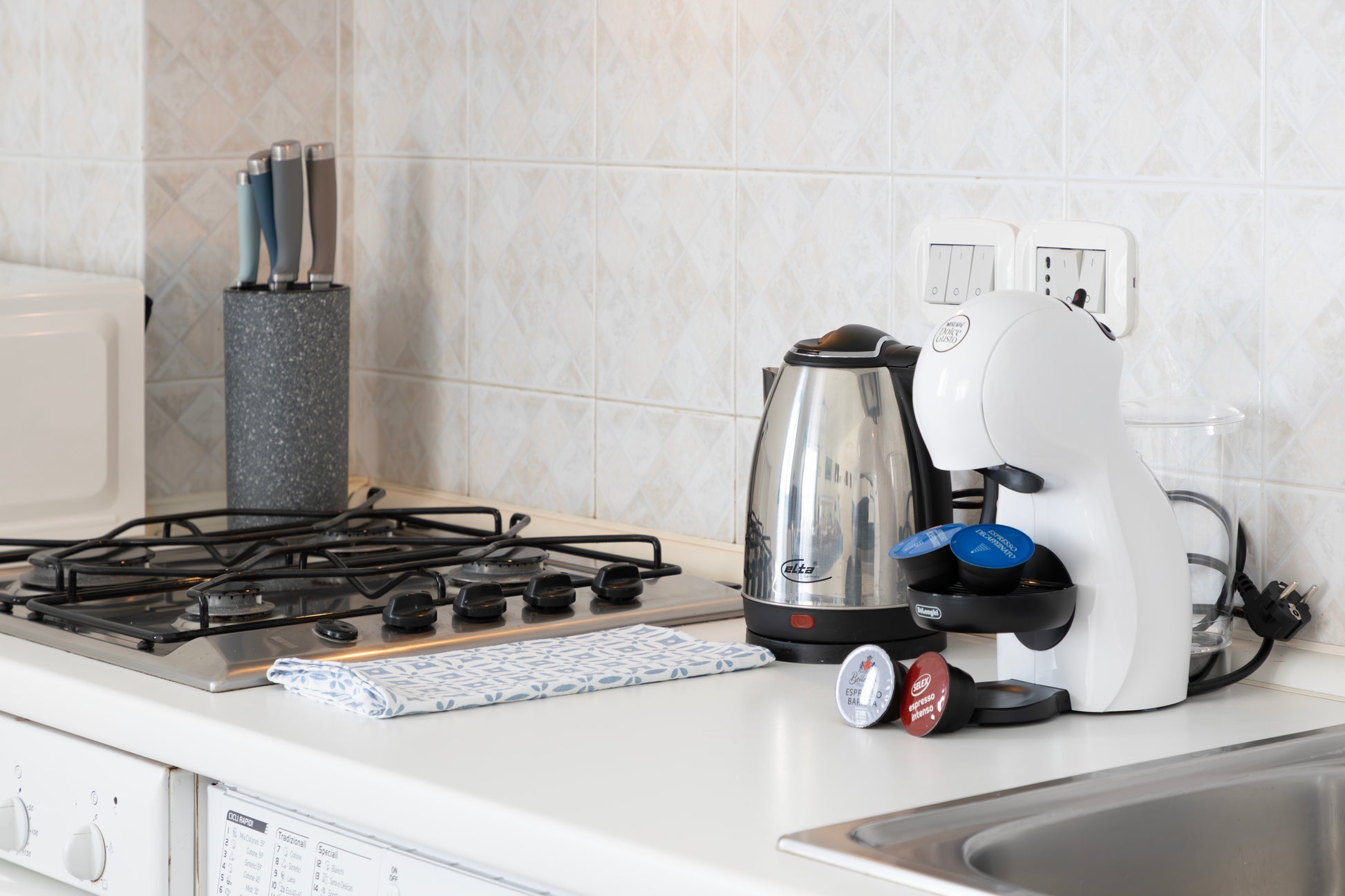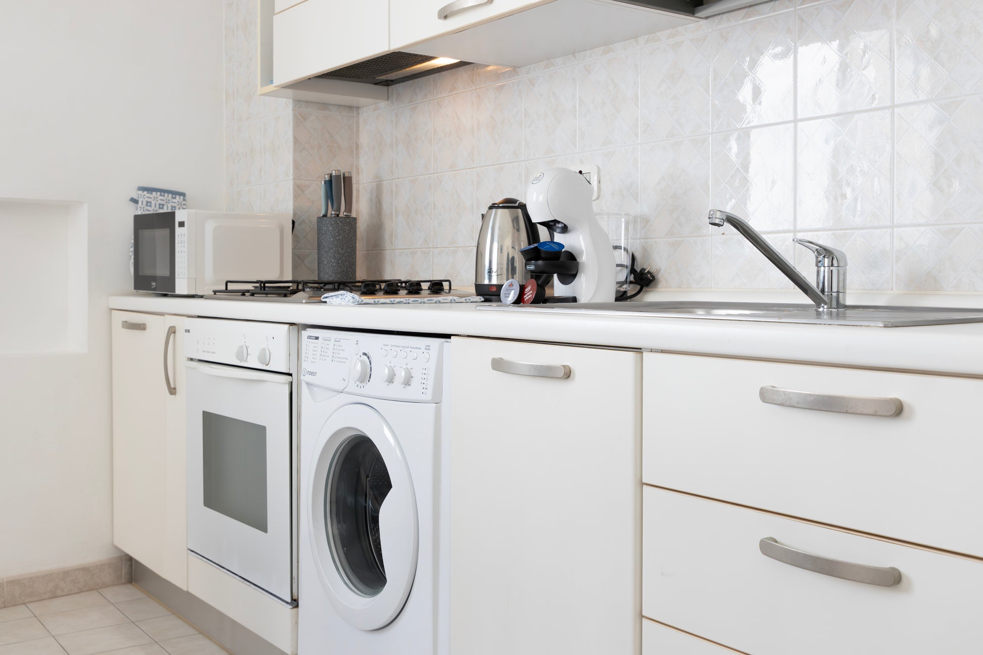 La cucina perfettamente attrezzata dispone di tutto il necessario tra cui stoviglie, piatti, utensili, macchina per il caffè con cialde, caffettiera, bollitore, forno a microonde, frigorifero, freezer e lavatrice.